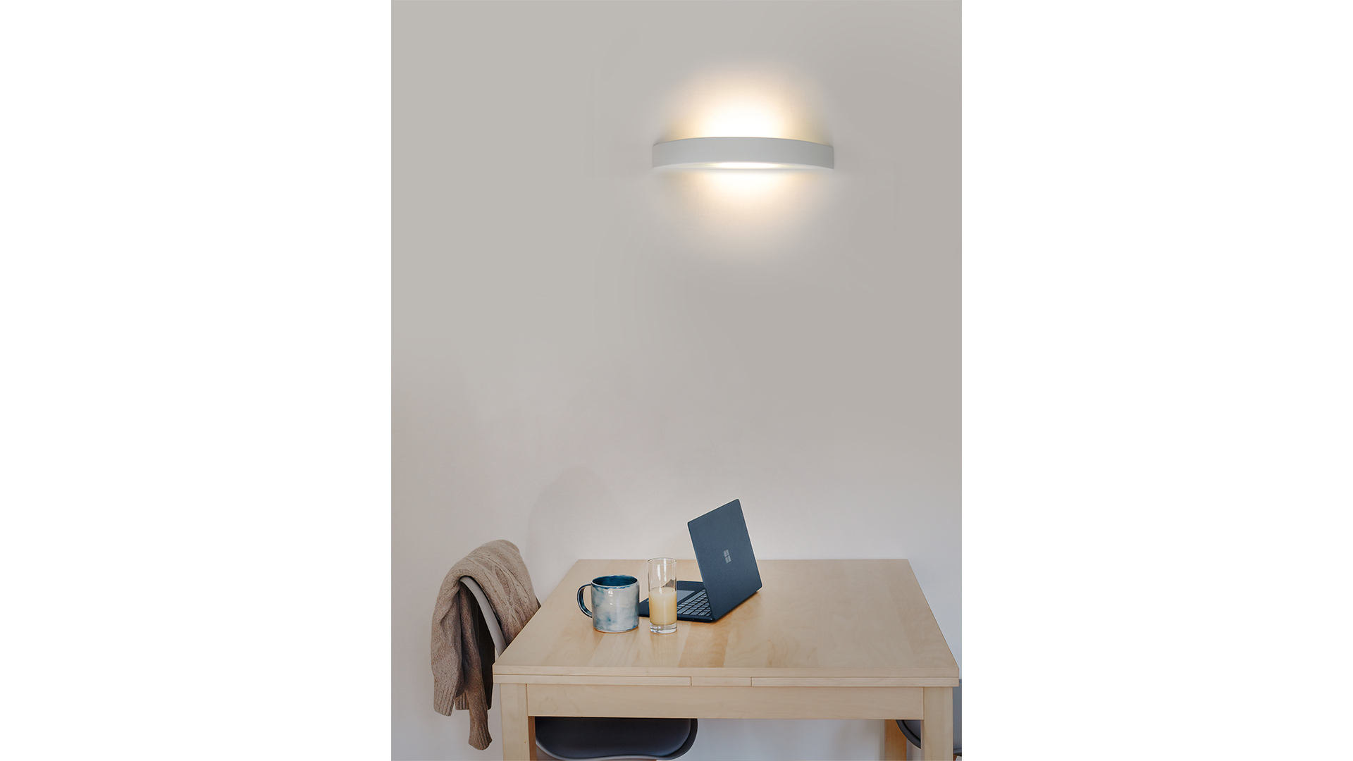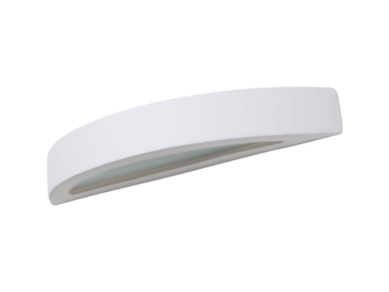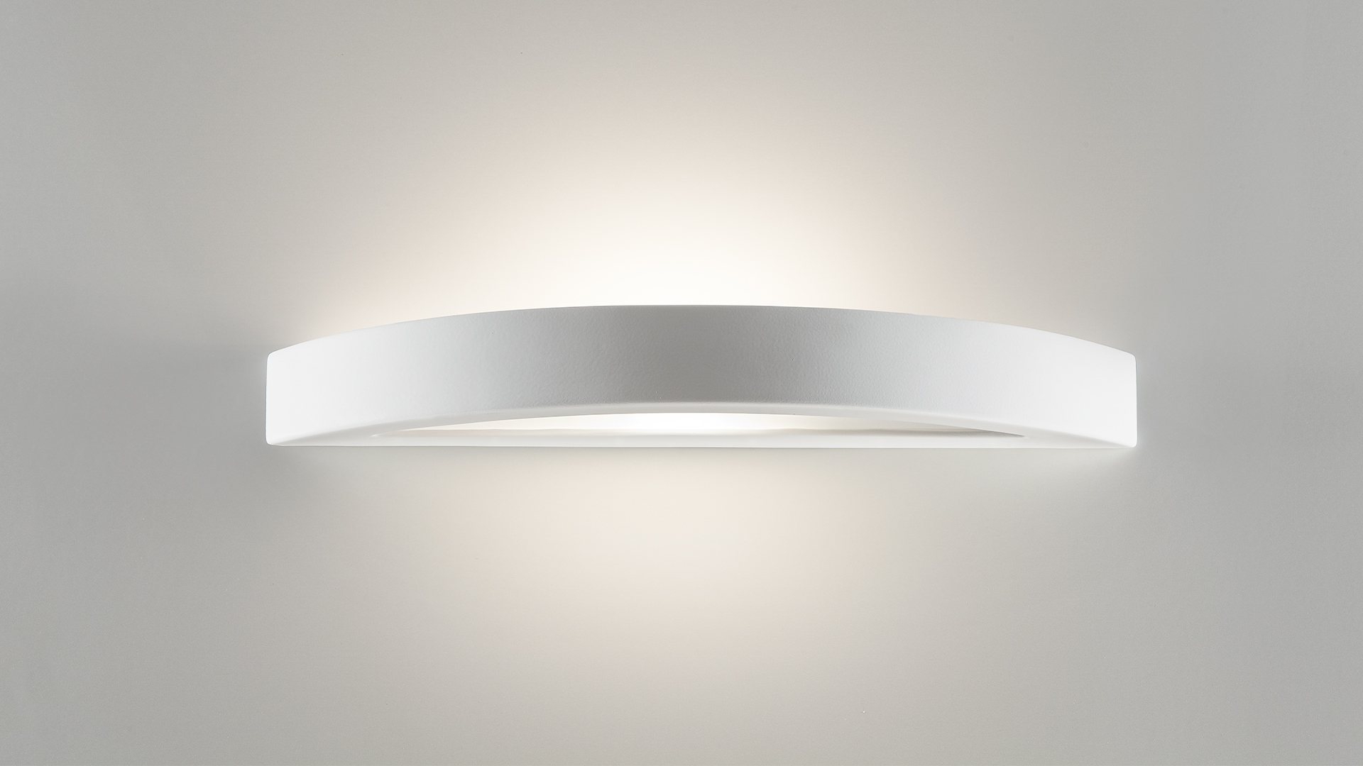 Its shape evokes a hollowed half-moon from which a gentle, diffused glow emerges, casting serene indirect light that enhances modern interiors.